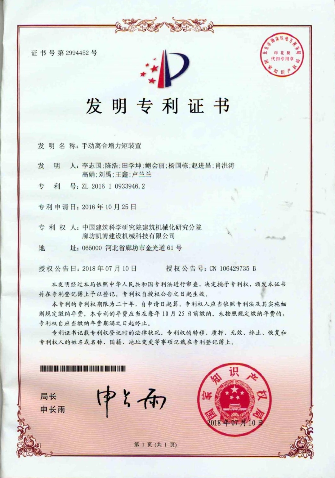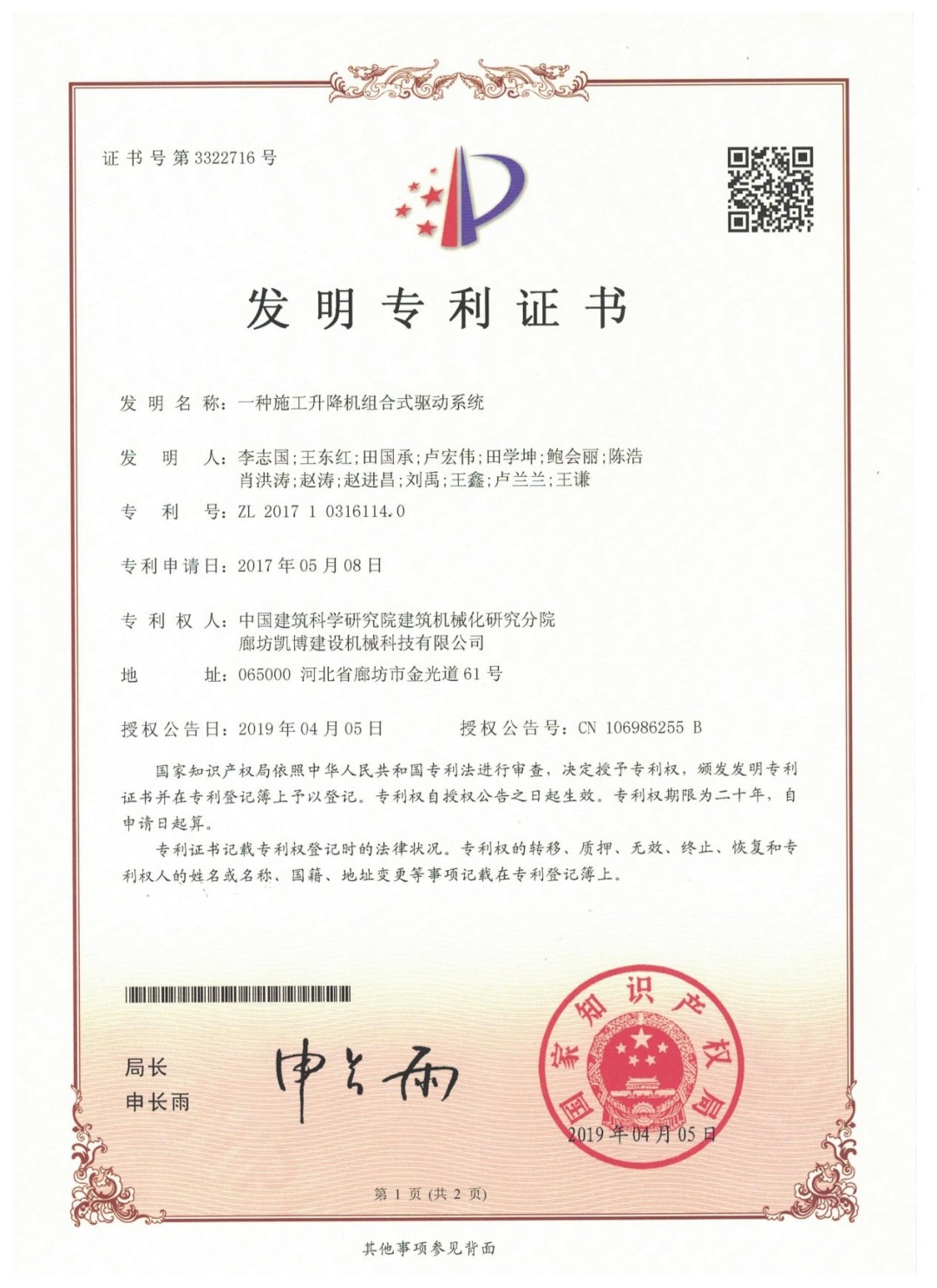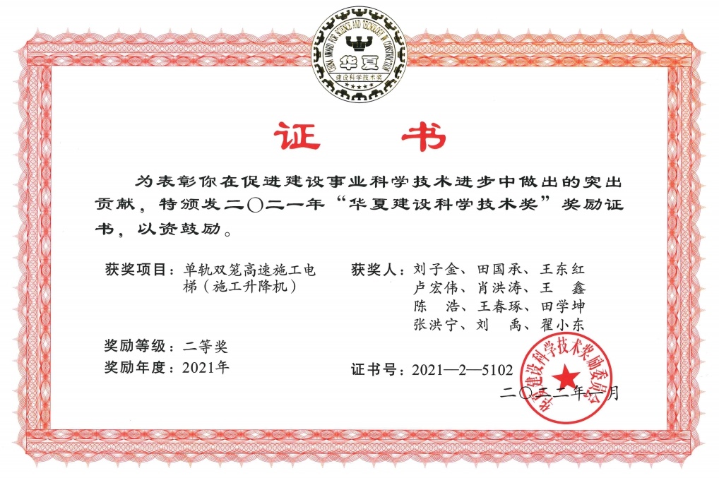 ? ? ? ? ? 本產(chǎn)品獲2項(xiàng)發(fā)明專(zhuān)利——施工升降機(jī)組合式驅(qū)動(dòng)系統(tǒng)(專(zhuān)利編號(hào):ZL201710316114.0)和手動(dòng)離合增力矩裝置(專(zhuān)利編號(hào):ZL201610933946.2);主編參編GB/T37537-2019《施工升降機(jī)安全監(jiān)控系統(tǒng)》、GB/T 26557《吊籠有垂直導(dǎo)向的人貨兩用施工升降機(jī)》兩項(xiàng)國(guó)家標(biāo)準(zhǔn);2021年榮獲“華夏建設(shè)科學(xué)技術(shù)獎(jiǎng)”二等獎(jiǎng)。為解決我國(guó)超高層建筑人員物料垂直運(yùn)輸?shù)母咝О踩椒€(wěn)運(yùn)行難題提供了強(qiáng)有力的技術(shù)支撐。