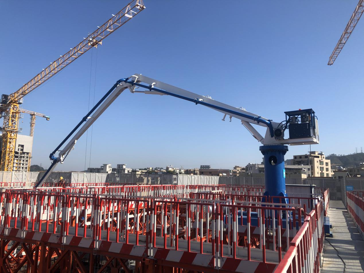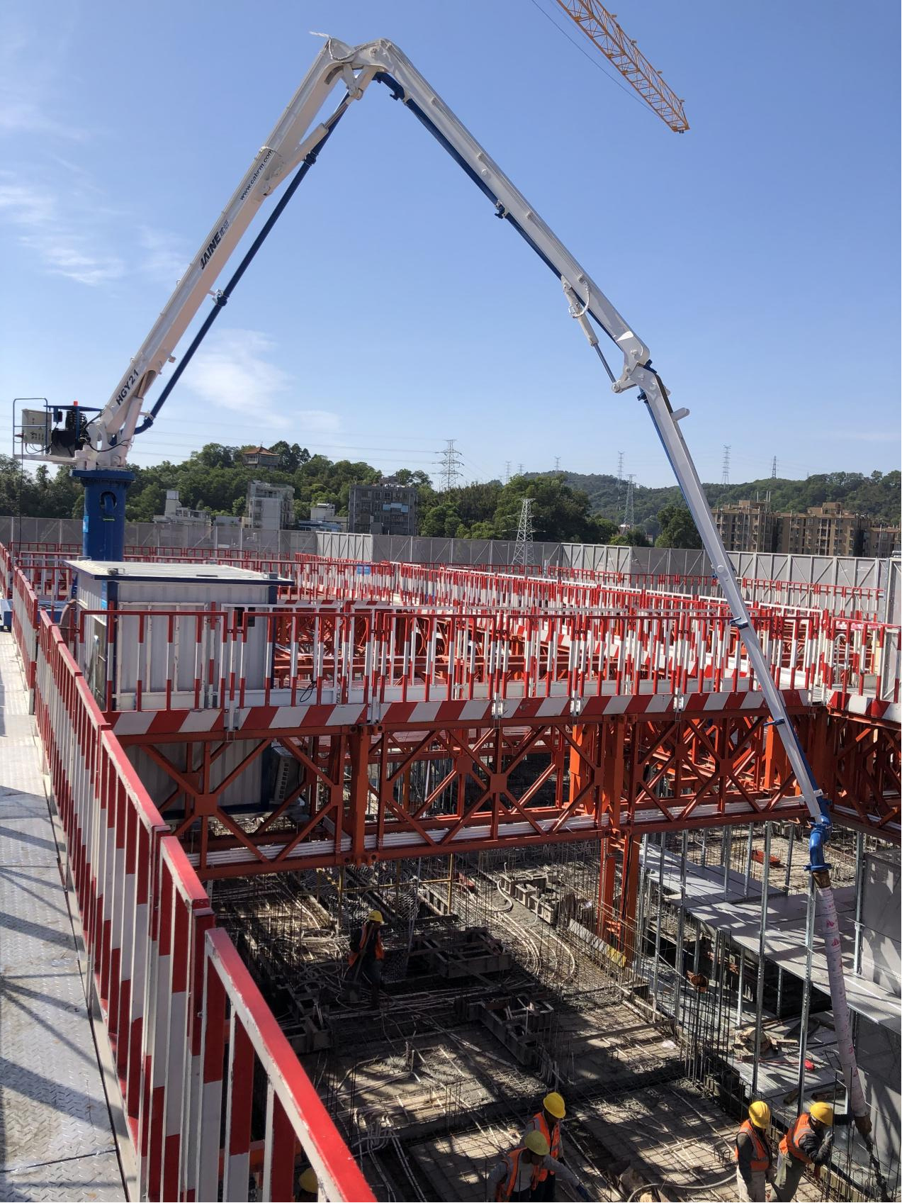 模架式液壓混凝土布料機(jī)自帶鋼平臺底座,與爬模架體連接傳遞施工載荷,無需自帶動力系統(tǒng),爬模爬升時帶動其爬升。其中HGY21模架式液壓混凝土布料機(jī)于2021年11月成功應(yīng)用在使用“住宅造樓機(jī)”的裝配式建筑領(lǐng)域(中建三局承建的廣州大源村項目)。